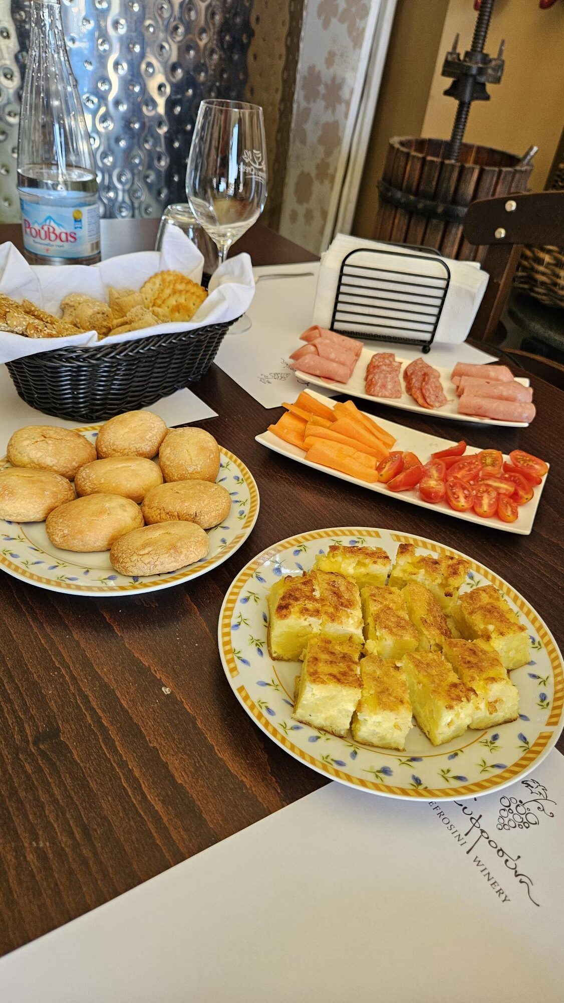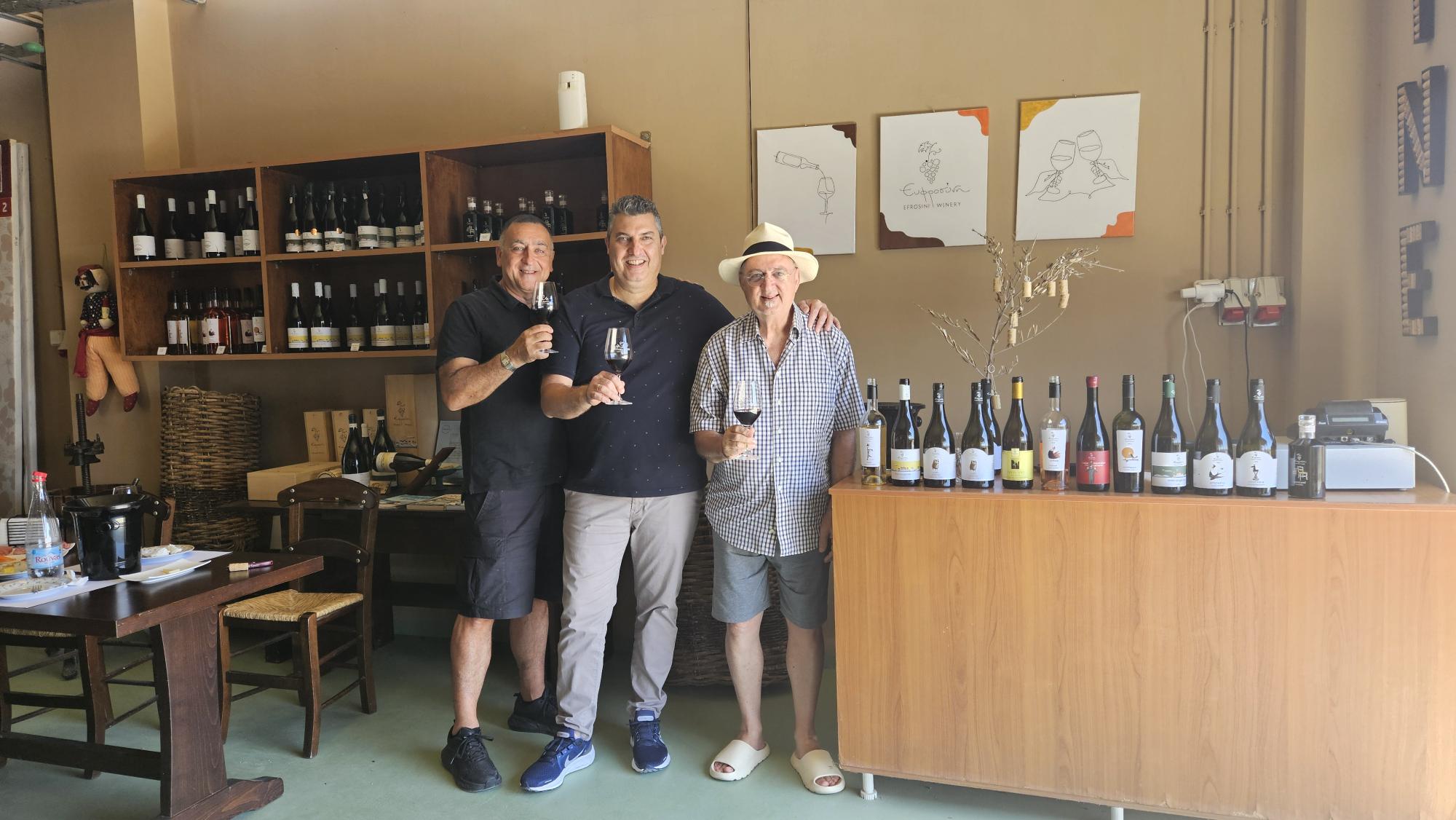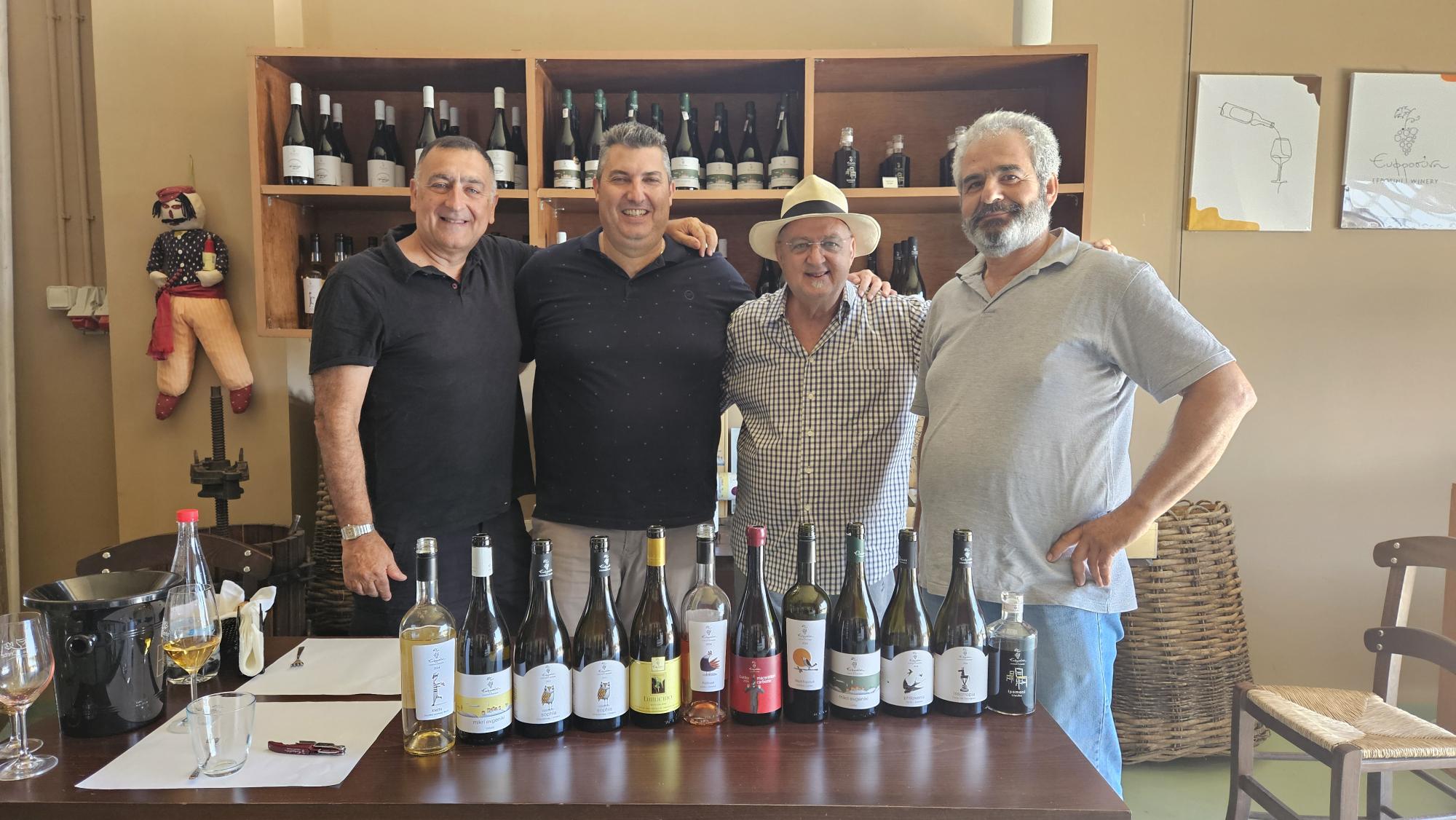 Η υποδοχή και η φιλοξενία υπήρξαν πραγματικά υποδειγματικές. Ο Βαγγέλης Καλαντζάκης μας καλωσόρισε με θέρμη και αυθεντική κρητική ευγένεια, οργανώνοντας μια πλήρη και άρτια οινογευσία. Οι γνώσεις του, το πάθος του και η αφοσίωση του στην ουσία των πραγμάτων έδωσε τον τόνο για τις γευστικές μας δοκιμές. Ο Μανώλης και η Κατερίνα Κοσμαδάκη, εκπρόσωποι της νέας γενιάς του οινοποιείου, μαζί με τον ιδρυτή Αντώνη Κοσμαδάκη, συνέβαλαν ουσιαστικά στη συζήτηση, μοιραζόμενοι τη φιλοσοφία και το όραμα για τα κρασιά τους. Η παρουσία του φίλου Βαγγέλη Κακουδάκη, δημιουργού της εκπομπής Άκρατος Οίνος, πρόσθεσε μια ακόμη διάσταση στην εμπειρία. Δοκιμάσαμε από κοινού όλη τη γκάμα των κρασιών της Ευφροσύνης σε μια ατμόσφαιρα ζωντανής ανταλλαγής απόψεων, καθιστώντας την επίσκεψη όχι μόνο απολαυστική αλλά και ουσιαστικά ενδιαφέρουσα.