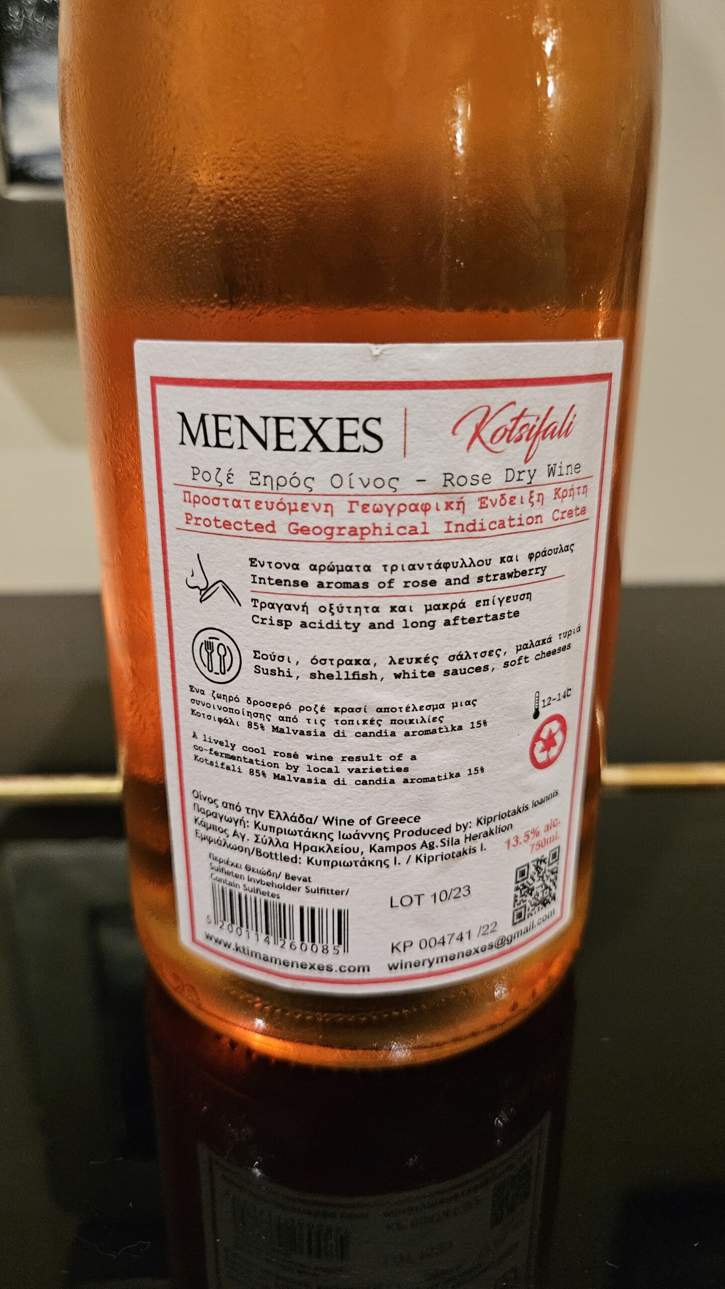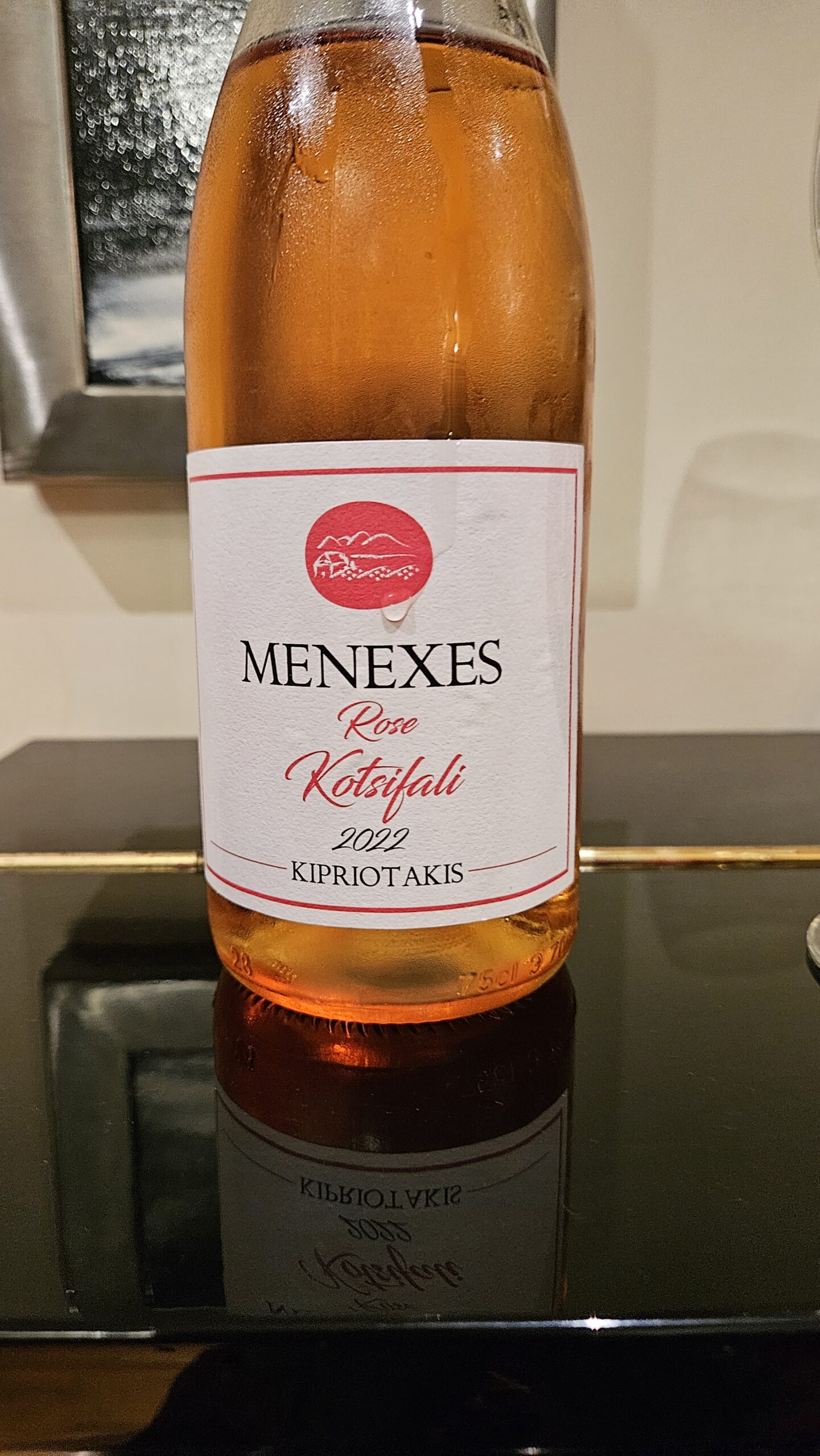 Ένα Κοτσιφάλι από το Κτήμα Μενεξές, της οικογένειας Κυπριωτάκη, το οποίο βρίσκεται νότια της Πόλης του Ηρακλείου, στην ζώνη Π.Ο.Π. Άρχανες – μία από τις σημαντικότερες ζώνες της Κρήτης. Αυτό το ροζέ είναι ένα blend ap;o Κοτσιφάλι (85%) και Malvasia di Candia Aromatica (15%), συνδυάζοντας θα έλεγα, παράδοση και φρεσκάδα. Θεωρείστε ότι πίνουμε ένα Κοτσιφάλι δεξαμενής με προσωπικότητα, όπως όλα τα κρασιά του Κυπριωτάκη, με τις μικρές πινελιές της Μαλβαζίας.